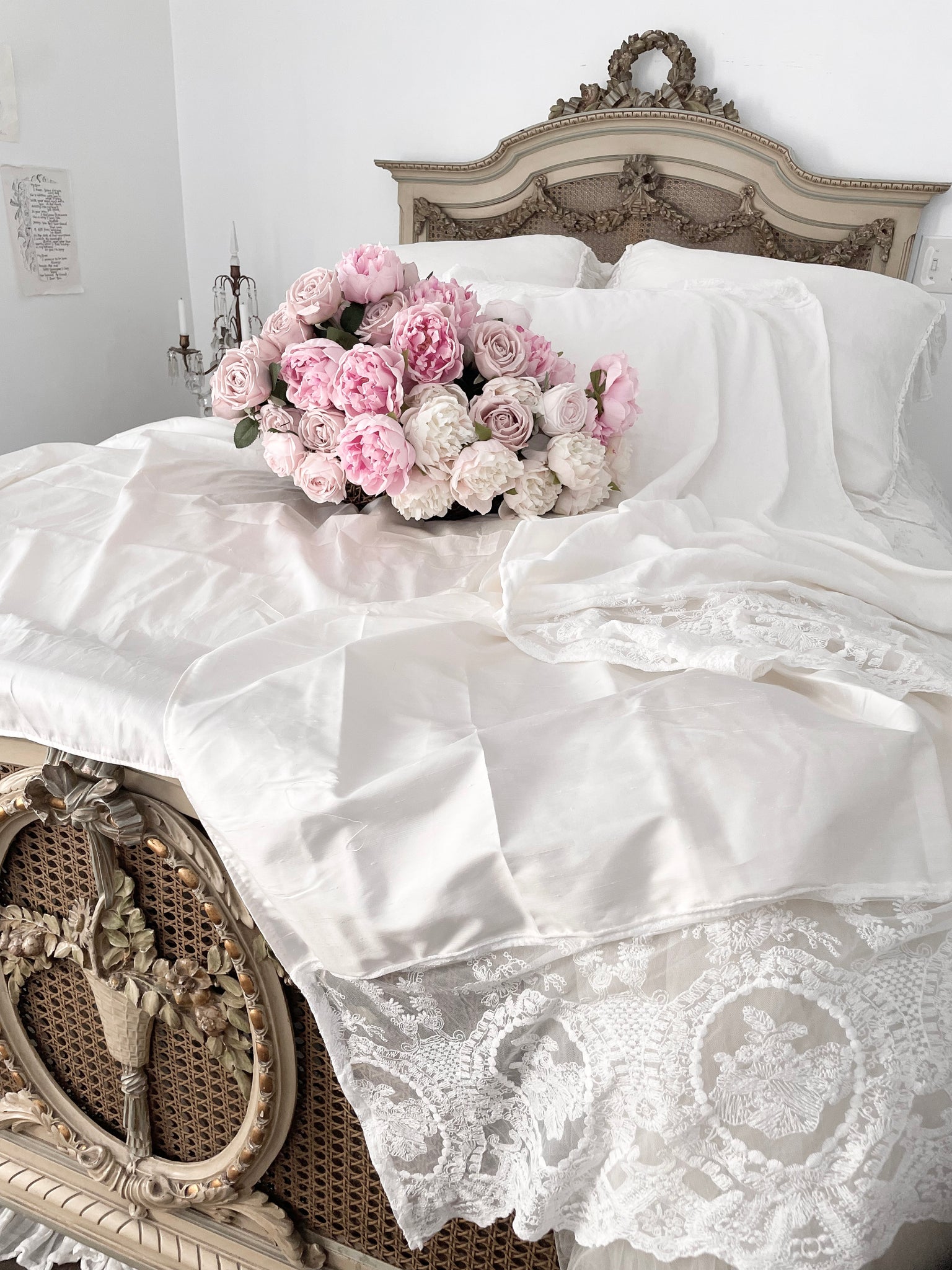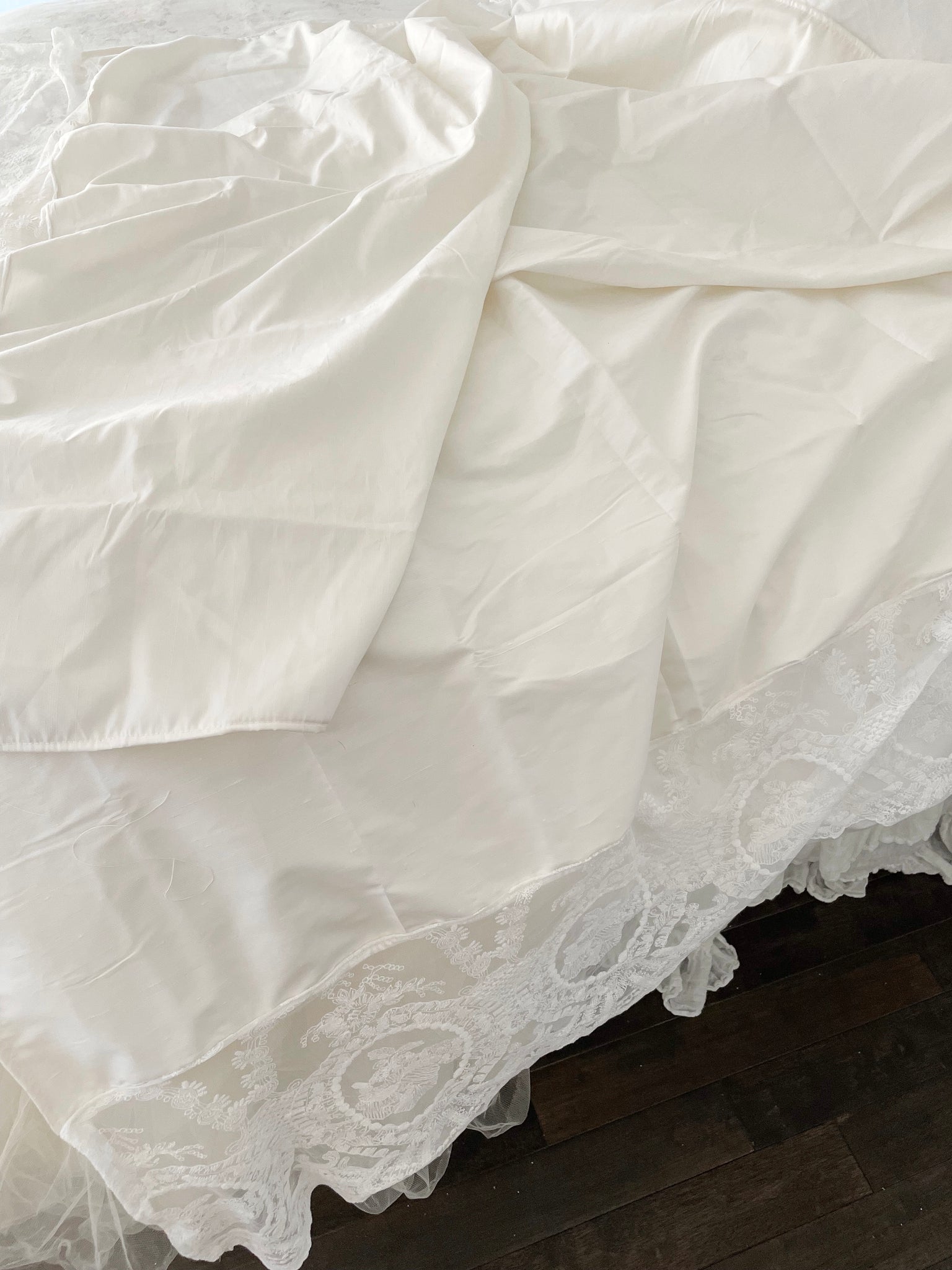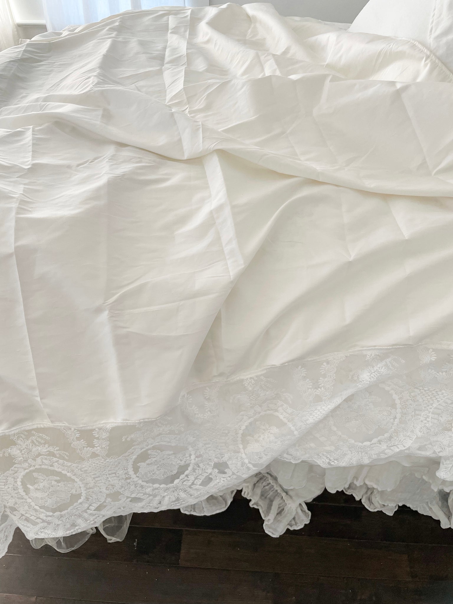Handmade by me with pure winter white silk and French lace large tablecloth or bed scarf. This is large and size so looks amazing draped over a bed or used as a tablecloth. This measures approximately 48 inches wide by 96 inches long. This was called white but it’s a tad off white not cream