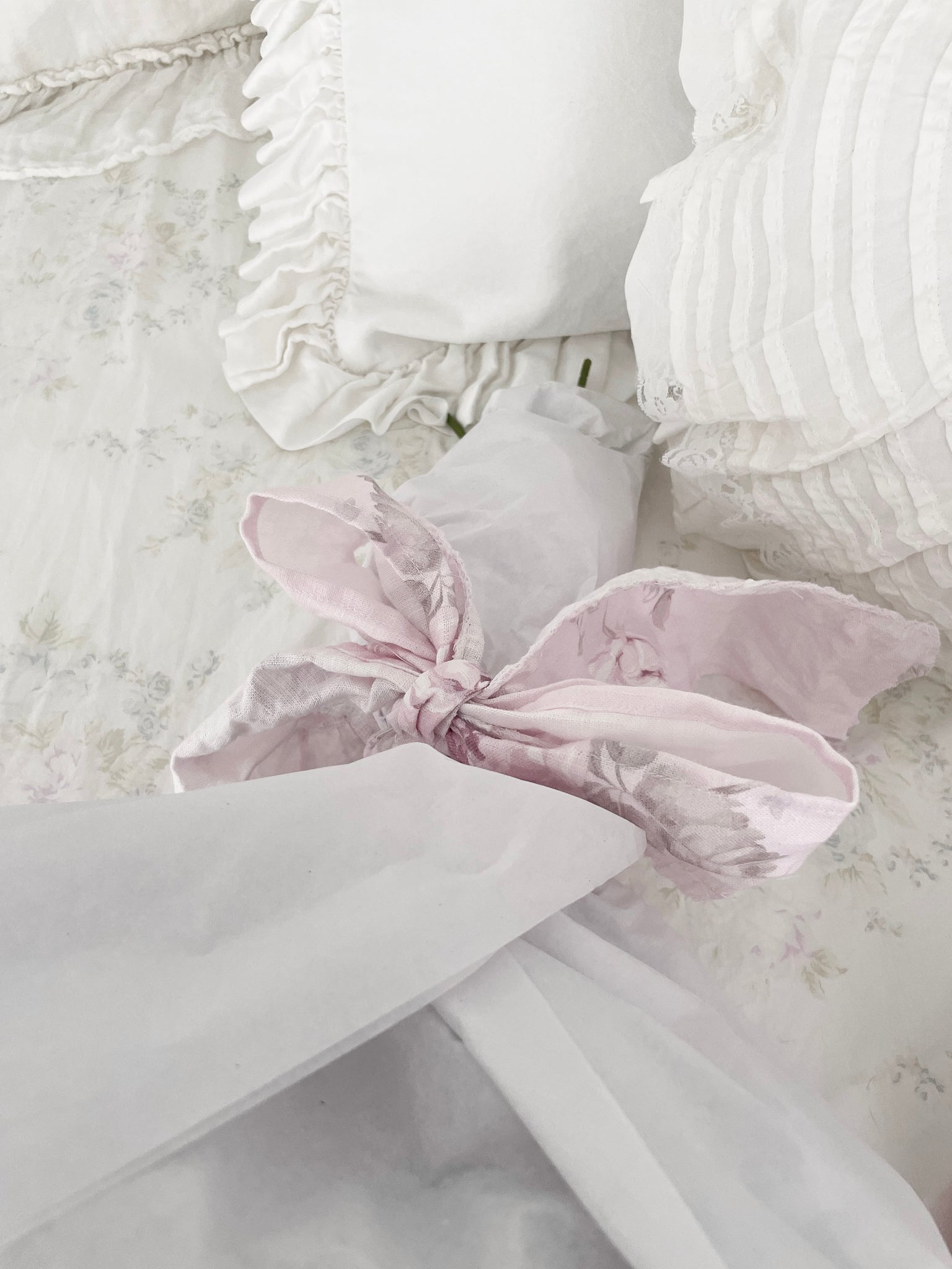 Bouquet of realistic mixed perfect pale pink garden roses two dozen 24 roses wrapped in tissue with ra pink floral fabric ribbon tied in a bow ready to gift. I have two of these each sold separately in different listings.