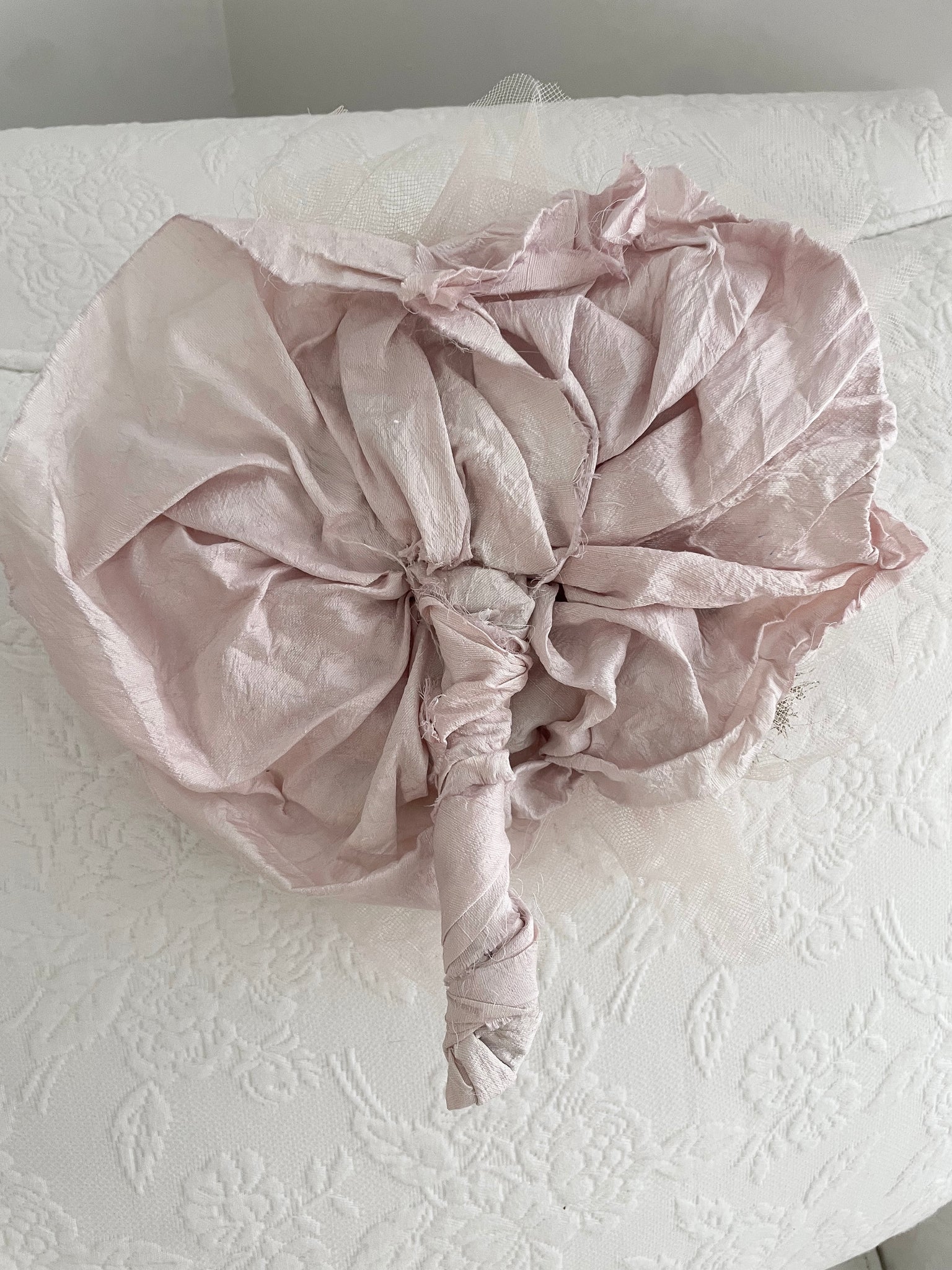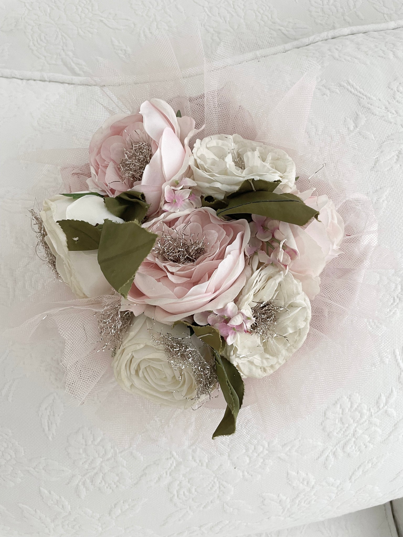 Handmade floral bouquet with real feel garden roses antique silver tinsel antique millinery leaves, vintage pink tulle and hand overdyed silk dupioni. Only one This measure is approximately 10 inches across